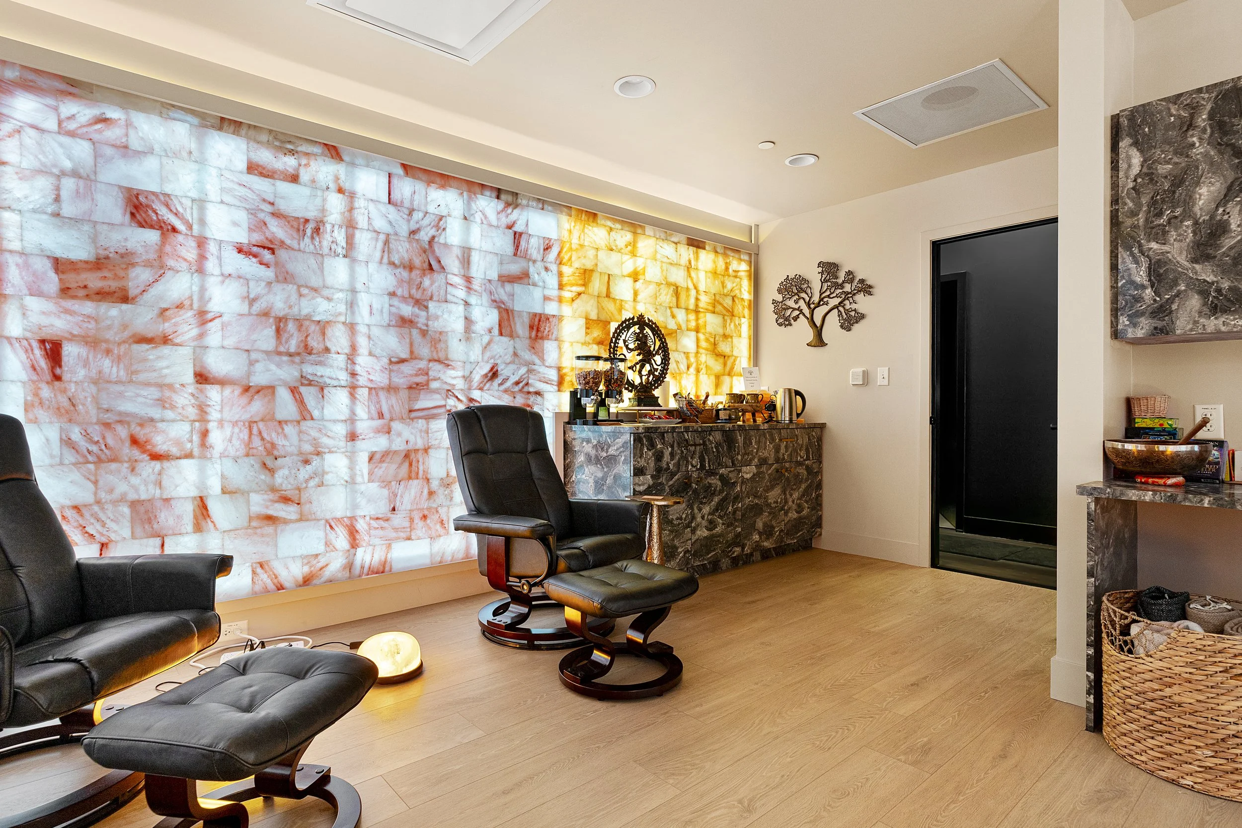 Time out never felt so good! Himalayan Salt Wall Benefits - Improved air quality: Himalayan salt walls release negative ions that can help purify the air by neutralizing harmful pollutants and allergens. Relaxation: The soothing glow of the salt wall can create a calming atmosphere, helping to reduce stress and promote relaxation. Enjoy our designated “quiet zone” before or after your treatment, or book your time in this space on its own.
